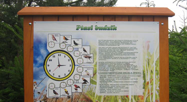 Szlak rozpoczyna się tablicami, na których: umieszczono wiersze znanych poetów o tematyce przyrodniczej i patriotycznej m.in. tablica „Drzewo prawdę Ci powie” – czyli horoskop drzewny. Dalej ścieżka prowadzi w kierunku iglastego lasu obok „Ptasiego Zegara” , informującego o gniazdujących w okolicy ptakach. Tablice informują spacerowiczów również o występujących na obszarze drzewach, ptakach i zwierzętach. Docelowo ścieżka prowadzi do „Krasnej Góry”. Tutaj w roku 1920 miało miejsce ważne wydarzenie historyczne – bitwa Polaków z bolszewikami. Poległych w walce żołnierzy polskich i rosyjskich pochowano we wspólnej mogile tuż za wsią, i upamiętniono tablicą. Z „Krasnej Góry” możemy obserwować charakterystyczny dla obszaru krajobraz – ekosystem pól uprawnych.